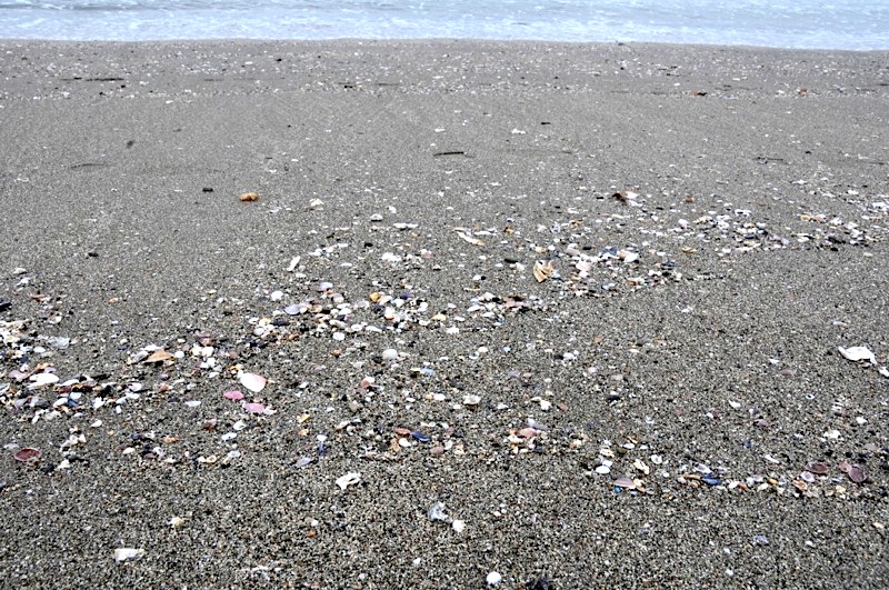 波打ち際に目を凝らすと、うっすらとしたピンク色の貝が目につきます。写真中央よりやや左下に3枚ほど置いてみました(笑)。